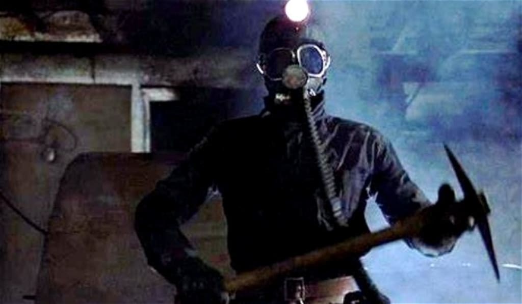 My Bloody Valentine is a glum little slasher flick from 1981 about a mining town—presumably somewhere in West Virginia—where everyone is just ga-ga-gooey over a Valentine’s Day dance. Naturally, everyone works in the mine, and everyone knows the urban legend about a miner named HArry Warden, who was trapped in a cave-in and ate his co-workers. He gets locked up in a notorious urban legend-style mental home before being let loose—or escaping (I never did quite get this part right)—donning an oxygen mask and a hard hat with a lantern on top, and setting out to avenge his... well, I don’t suppose it would be his death, but his madness, at the very least.