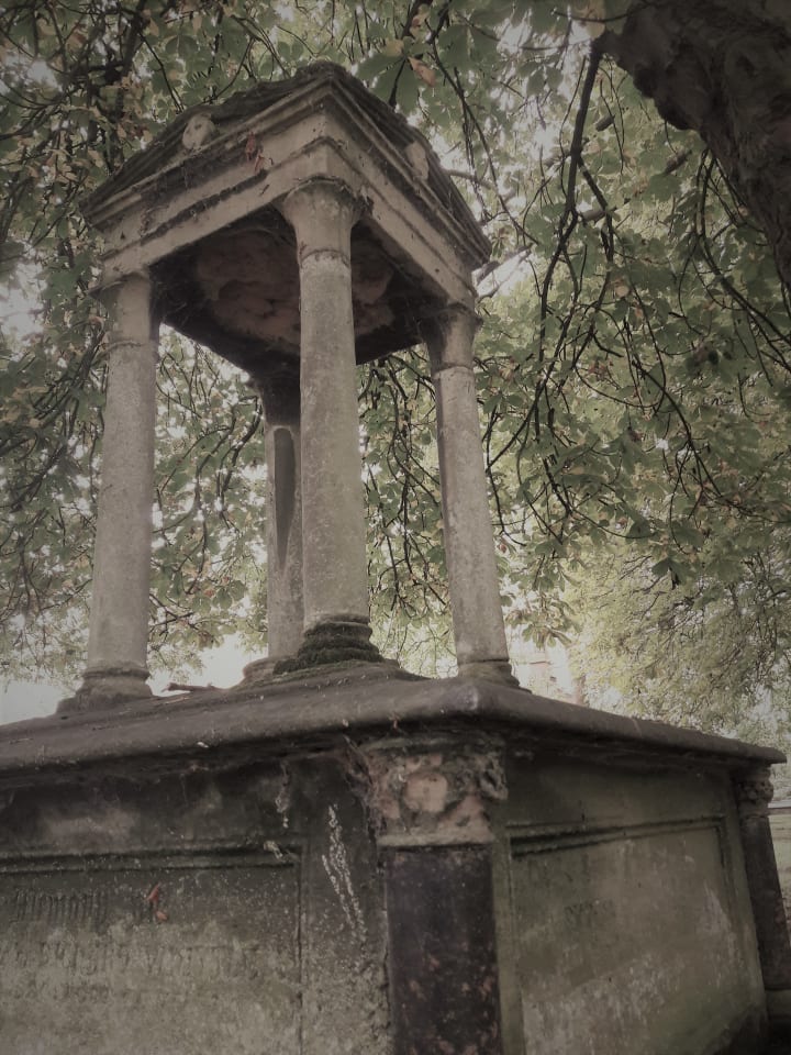 This graveyard is home to several fascinating and beautiful stones. This is another, built like a Greek temple, and another which appeared to once have railings which were removed.