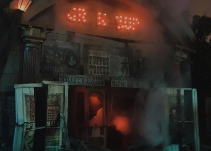 Glory, it was gory! I love when HHN caters to the minor history nerd inside me with speculations on how much more horrific could history be. I loved how detailed this house was, and some of the amazing scares that could be found here. The fact that the house smelled like baby powder, more than likely in reference to all the powder that was used cosmetically for actors in the theatre? The crumbling edges of a once thriving, ornate theatre that is now home to inhumane acts of obscenity. The way that the house went from back stage to the front stage? The mirror scare?! I loved watching people near jump out of their skins with that one. I don't know, something about being around unhinged people is so comforting to me. Let's me know that I'm still not as bad off as I think I am, you know?