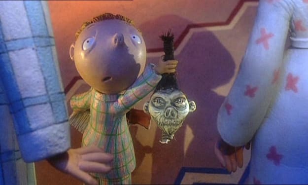 So apparently demon mascots now have yellow blood too — always good to know when battling satanic forces. There is the synonymous cut to black as the protagonist manages to escapes and the story ends there: