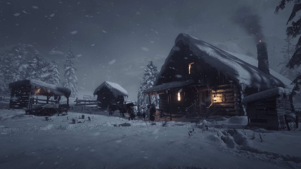 She peered through the flurry and the trees towards the Old Man's cabin. She got lost deep in thought until she noticed that she was looking right at something she mistook for moonlight reflected off the rushed, dancing snow. But the lights were fixed.