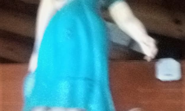 The sweating trembling hands gingerly nudged the door, and the door silently.., thankfully silently.., eased open, allowing the eyes to behold the specter of a conjuring nymph as she whispered her chanting song that rode forth on the heavenly wind. She sat about in a long sable satin dress upon a large lace covered canopy adorned feather bed mattress, gazing into a bronze hand held mirror, gently caressing a solid gold crucifix that she bore on a chain of emerald and gold about her pallid neck. As she spoke into the mirror, she moved her hands about the crucifix in a caressing, loving stroke of compulsion.., as though she were speaking unto an unseen presence.