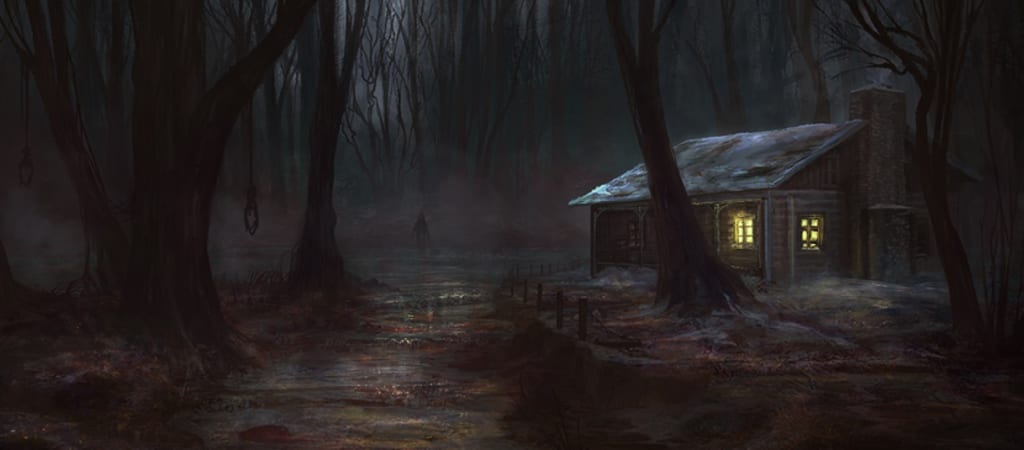 What WAS it? It was gone now, but I know I saw it. Panning my flashlight in every direction, I deemed us safe and proceeded forward. Another 300 feet, give or take, and I could make out the cabin I'd heard so much about. The very reason we were here. It DID exist! I felt immediately uneasy and lowered my flashlight so it was barely illuminating what lay before us.