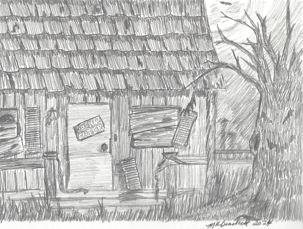We stood frozen for only a moment before pushing against each other to enter and Bradley turned on the flashlight, sending unseen terrors skittering into the darker recesses of the room. Dark stains of dried blood covered the floor, splashed across the walls, and as we watched with growing horror, began to drip once again from the ceiling as the flashlight guttered out and the door slammed closed behind us.