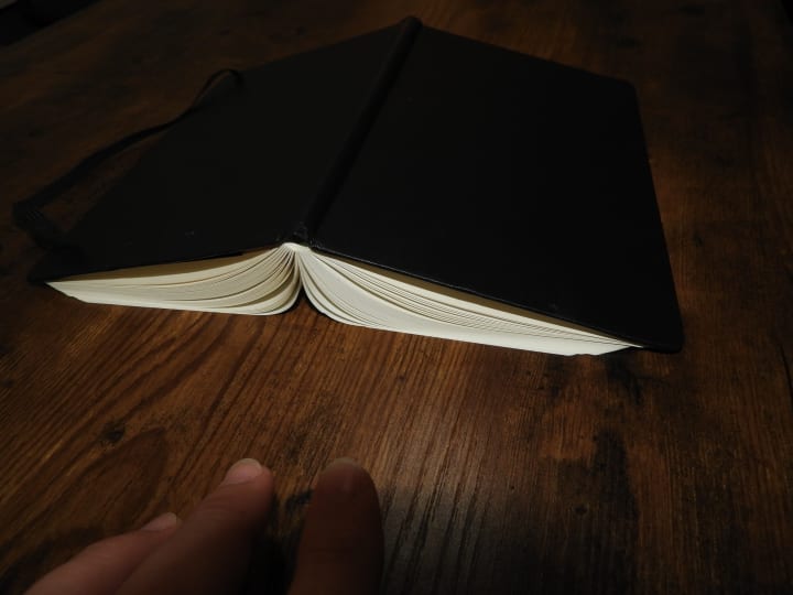 He approached the desk and saw that there was an open notebook with a few drawings on it. “Rebecca…” he said out loud to get her attention from the room downstairs. A diagram was drawn in thick maroon ink, surrounded by some strange symbols of the same colour. The drawing was meant to be a pentagram. However, it seemed to be missing a couple of lines to form the usual five-pointed star figure. Nathan closed the book and turned it around. From the outside, it seemed like a normal, barely used black notebook, with an elastic band to hold it shut. It even had the engraved Moleskine logo at the bottom of the back cover. Nathan opened it again and skimmed through the empty pages until he arrived at the pentagram drawing again. He heard Rebecca’s footsteps getting near the stairs, and her voice saying, “did you find something?”
