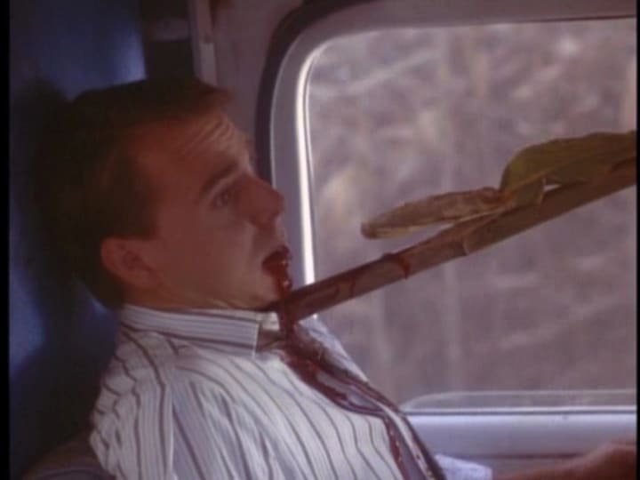 After acting like High School bullies, the TV guys head to a nearby cornfield to shoot some B-Roll. This is the filler material you see editors use to transition from one part of a story to another. There, in one of the great unintentionally comic moments in this rather brilliant unintentional comedy, Corn comes to life and kills the TV guys. Stalks of literal corn come to life and use their sharp leaves to slice the throat of the cameraman while another corn stalk launches itself like Poseidon's Trident through the window of the news van, impaling the reporter.