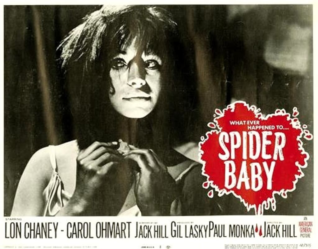 Spider Baby is a cinematic tale starring Lon Chaney Jr. and his obviously booze-ravaged visage. Also starring Sid "Captain Spaulding" Haig—the late and great one of House of a Thousand Corpses and other Rob Zombie infamies. We also get Mantan "King of the Zombies" Moreland in a bit role right up front as a Black messenger dude in an old-fashioned chauffeur outfit, who gets killed by being jammed in a window by a young woman—Virginia (Jill Banner)—holding a butcher knife in both hands, who happens to think she's a spider. (Well, I mean, if you identify as a spider and all, who am I to judge? An early pioneer in the furry community, perhaps.)