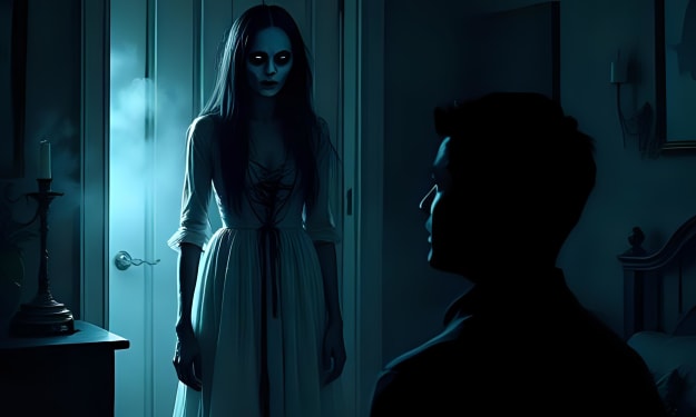 Then, a woman appeared in the mirror. Long black hair, a white dress... and glowing red eyes.
