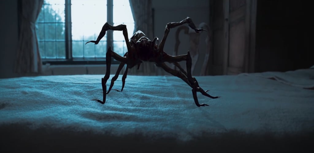 I say "spider-like" because its head had been replaced with a human one, its eyes were covered in the moonlight's shadows, and its lower jaw had been removed, revealing a blotchy tongue that oozed saliva. It was about the size of a twin bed and stared at me for what felt like hours. My heart was racing and I begged my body to move, but I was trapped there in suspended torment. I tried screaming, but all I could manage