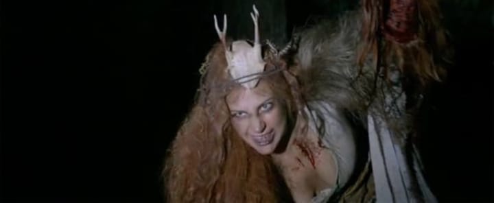 It was another week of gore and guts over on American Horror Story: Roanoke, but something other than blood was spilled during the fourth episode. We finally got some insight into Lady Gaga's mysterious wood-witch-nyph-lady. Wardrobe costs were low as Gaga romped around in her antler fascinator and matted red wig. Pre-dating even the Salem witches, could Gaga be some great descendent of those wonderful Coven witches, or one step further — the very first Supreme? It would at least explain where Stevie Nicks got her lusty vocals from.