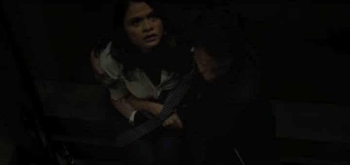 There's nothing discernibly horrifying about this scene other than two individuals have their legs dangling in an empty elevator shaft. To most, it wouldn't seem all that dangerous if you take the appropriate precautions, but when survival is determined by the number of people you kill, an opportunity to increase the kill count might provoke a weaker individual to throw someone down an elevator shaft.
