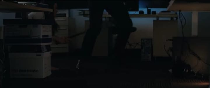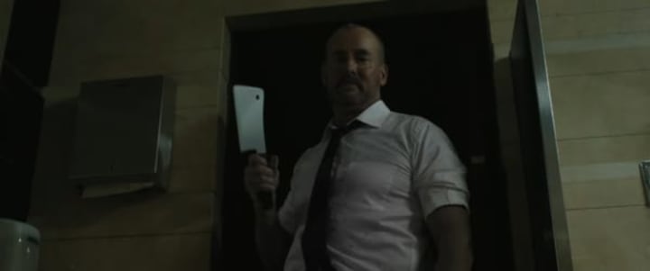 The first segment of the trailer introduced the outrageous order given over the intercom at work. Most would assume that a ridiculous directive like killing three of your coworkers would be taken as a very tasteless joke — and that's what it seems like — until one poor employee's head pops open like a balloon in a crowded room. That's when you know shit has hit the fan.