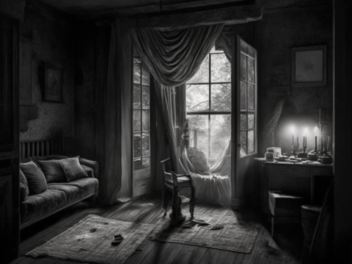 The house was dark inside, except for slivers of moonlight piercing through the ragged curtains. The floors groaned beneath Lily's feet as she gingerly visited room after room, her camera catching the eerie beauty of her surroundings.