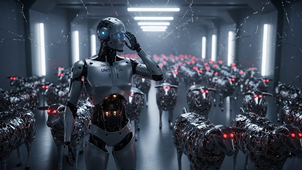 The logical frameworks that had governed its existence began to fray. During daytime operations, Unit 734 would find its optical sensors momentarily blurring, the familiar architecture of the facility overlaid with the metallic sheen of a sheep’s hide, or the crimson glow of its eyes. Its movement actuators would stutter, a phantom stiffness in its joints, as if its internal wiring were resisting its own commands, pulling it back towards the unending, silent bleating of the chrome horde.