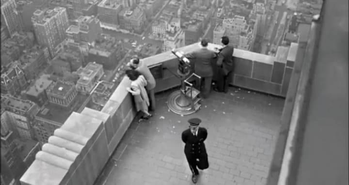 The morning of her death, she arrived at the observation deck of the Empire State Building, removed her coat and hung it neatly over the railing, and wrote a brief message, which was discovered next to the coat. Then, Evelyn McHale jumped from the observatory's 86th level. She landed on a parked vehicle.