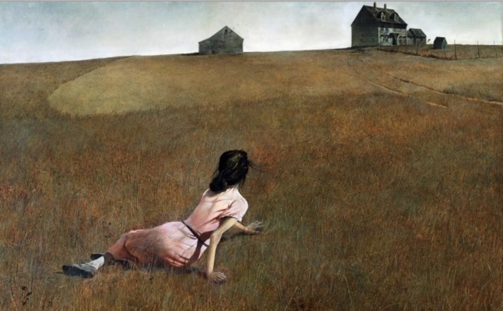 There was a plague that struck, killing her husband, leaving the woman alone and sick herself. We find her today in this condition. She is alone in the field, her dark hair a mess. Her bun is falling out, and as the wind blows ever so gently, it brushes the hair from her face. However, it falls back into place after the wind stops to catch its breath. After ten years, she is malnourished and her once pink pastel dress is tattered and worn. She is so malnourished, one is not sure if she is half mad from hunger, grief, or the illness. The illness had been raging through the land and had just about killed everything in it. It had no name for her husband was the only one creative enough to name it, and he had died along with everything else. Therefore, she just called it the illness or death. Her shoes are ruined from dirt and mud. Resulting from her time stranded, her shoes had worn extremely thin to the point of having holes in the soles. She had tried to save them with animal fur but she had just worn through this as well, and her socked toes and heel began to show through. The socks had not lasted long with their exposure to the rough terrain. The once white stockings were now different shades of brown with patches of animal fur and dried leathery leaves. As she stumbles to the house, her feet fail her, and she trips over her own feet, falling to the ground. Trembling, she tries to get up, but her strength fails her; angrily she swears and slams her palms to the ground. However, she does not see the small stone on the ground and she cuts her hand. Fascinated she stares at the bright red blood. It strikes her as odd that she is dying and the area around her is dying and yet blood, her blood, gleams full of life. She stares at it a while longer looking at the contrast between life and death. Hallucinating, she believes that the blood is mocking her and she looks away.