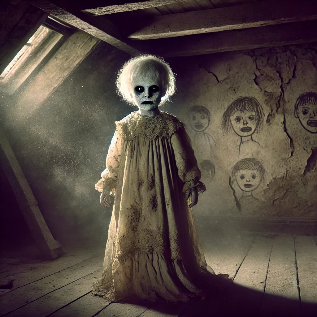 Desperate, she stumbled back into the attic and discovered a hidden trapdoor she had missed earlier. Driven by instinct, she pulled it open and descended into the pitch-black void below. The air turned frigid, wrapping around her like a vice. With her flashlight flickering, she entered a small chamber lined with damp, crumbling walls. There, she was met with a horrifying sight: the faces of children etched into the plaster, their expressions twisted in eternal anguish. “Help us!” they cried in a chorus that reverberated in her mind.