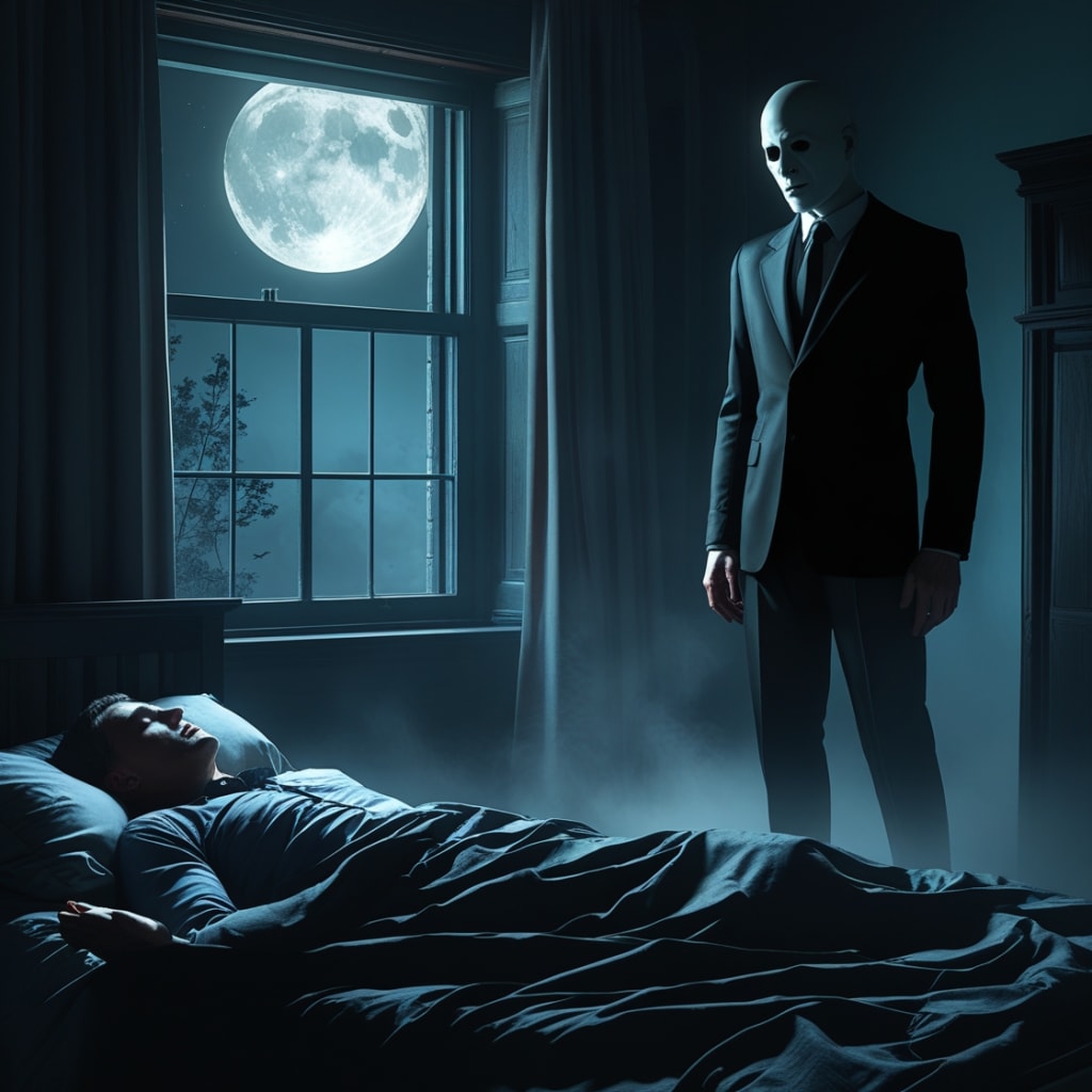 At the foot of the bed stood a man in a black suit, tall, face shadowed like someone had erased his features. He didn’t speak. He didn’t move. He just watched.