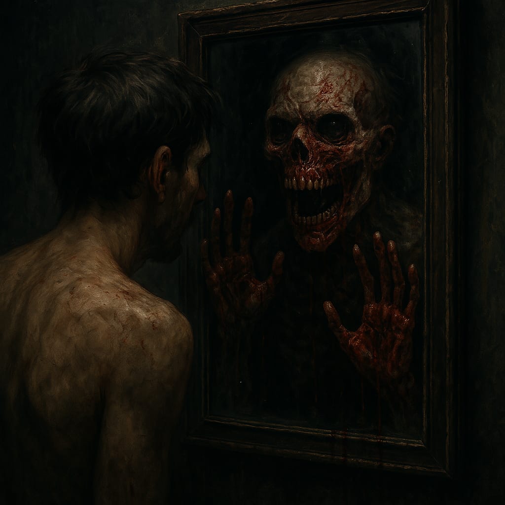 Evan abandoned that cursed bathroom, hoping to escape its sinister grasp, yet the unholy presence wormed its way into every reflective surface in the house—gleaming doorknobs, the frosted oven window, even the lifeless face of a turned-off television. Each mirror seemed to pulse with an unyielding appetite. Night after night, his reflection morphed—gradually discarding Evan’s familiar features in favor of a derisive impostor. Its skin began to peel off in scorched, trailing strips like burnt wallpaper, while its eyes ballooned unnaturally, glossy and vacant, as if they could weep torrents of ancient despair. The most unbearable torment was its nightly vigil—it did not simply haunt his dreams. One fateful morning, Evan awoke to the sight of that silent visage standing motionless at the foot of his bed—a grim, statuesque executioner whose sinister grin dripped an unspoken threat. In a desperate bid for control, Evan once smashed a shard of porcelain into the glass, carving a crude cross. But come dawn, his chest was reaped with three savage, identical gashes—deep, crimson, and alarmingly raw—a brutal testament to the internal decay he could neither halt nor escape.