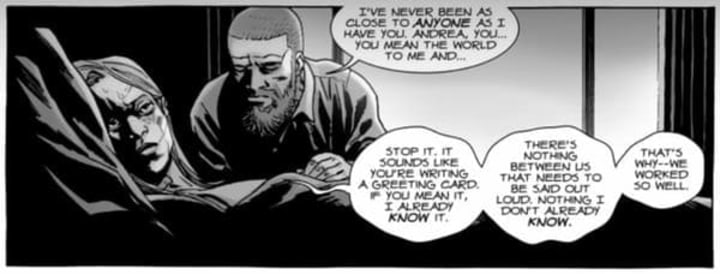 A little less than a week ago, Issue 167 of The Walking Dead comics was released, depicting one of the most shocking deaths to take place in the comics in quite some time. Andrea died after having been bitten by a walker in Issue 165. The bite came when she fought off a horde of walkers to save Eugene but wound up getting bitten in her escape. Her last moments in the most recent issue were spent with Rick...right before he put a knife through her reanimated head.