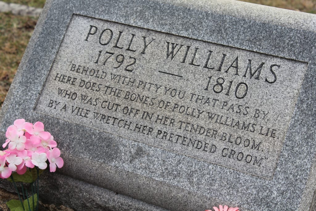 “Sacred to the memory of Polly Williams, who was found murdered at White Rock, August, 1810. Aged 18 years. Behold with pity, you that pass by, here doth the bones of Polly Williams lie, who was cut off in her tender bloom by a vile wretch – her pretended groom.”