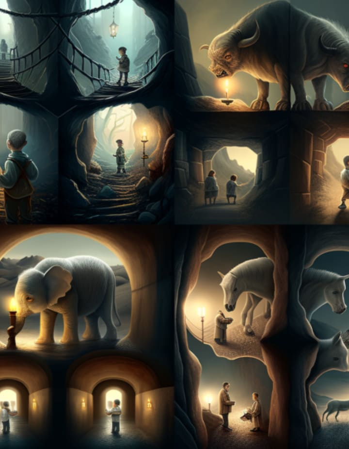 But as they approached the chest, they heard a low growl, and the hair on their arms stood on end. Suddenly, a pack of snarling dogs emerged from the shadows, teeth bared and eyes glowing in the darkness.