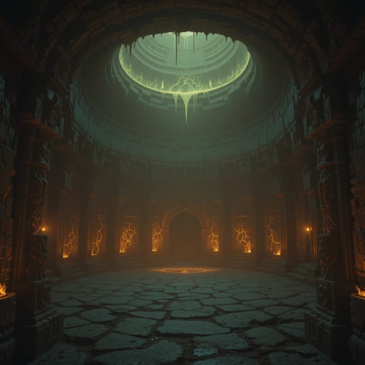 They ignored the tormenting visions, driving forward until the catacomb passage ended at a small, circular chamber. The air was now stiflingly hot, and the rhythmic thrumming was so loud it vibrated in their bones, a sound like a giant, slow-beating heart.