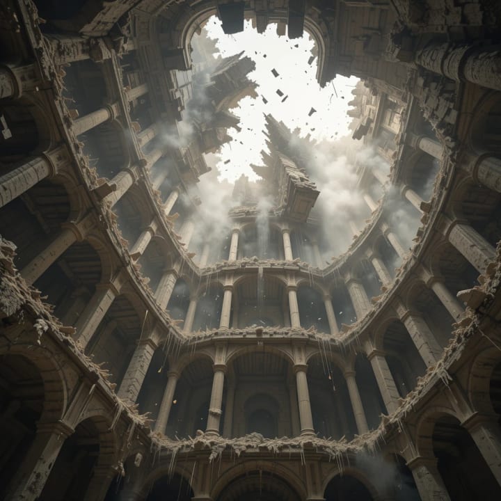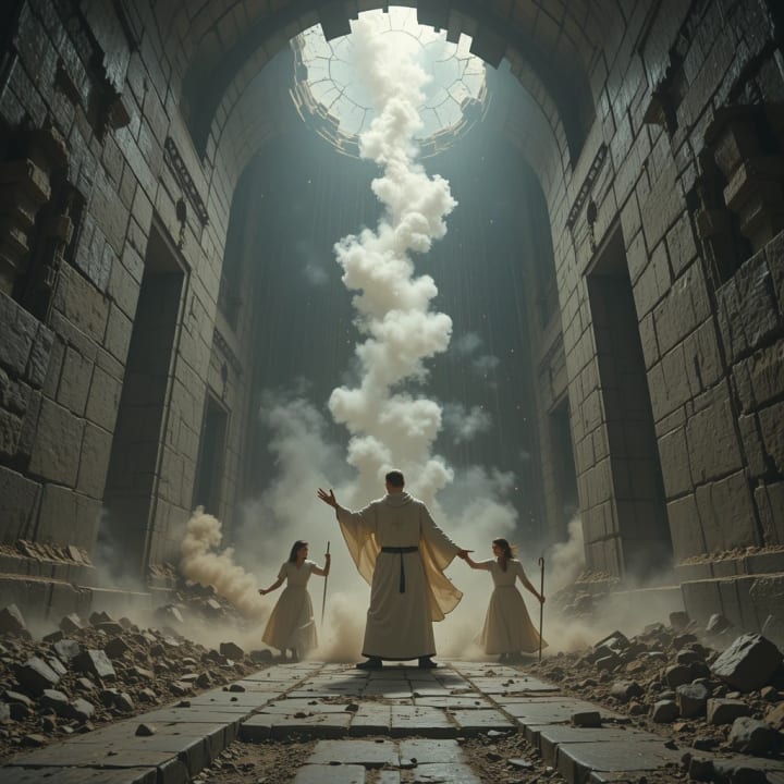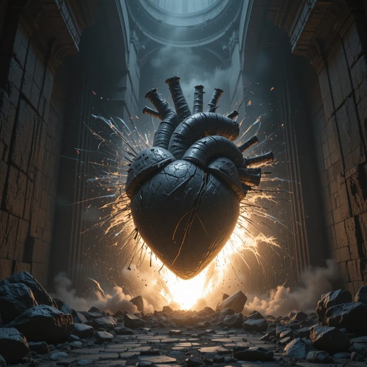 The petrified heart shattered with a sound like grinding stone and splitting earth. The chamber exploded with a deafening, sonic boom, and the oily black substance evaporated instantly, leaving behind dry, sterile dust. The rhythmic thrumming ceased. The entire monastery groaned, the sound of stone cracking and beams snapping echoing from above.