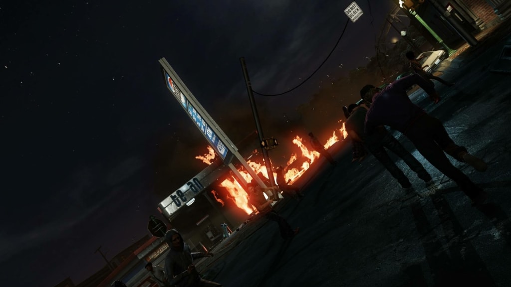 We drive down the maze of roads until we reach Sam's house. We see Sam on her lawn, smashing a Zombie's body with a steel baseball bat. Three hits to the stomach, then one blow to the top of the head, then nothing.