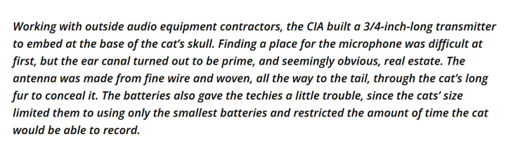 Although cats are unruly, the CIA felt they might become spies with training. The group also planned to use the animal's curiosity. It believed that a cat linked to capture sound may go undetected and be manipulated to record intriguing noises like Soviet leader speaks using audio cues.