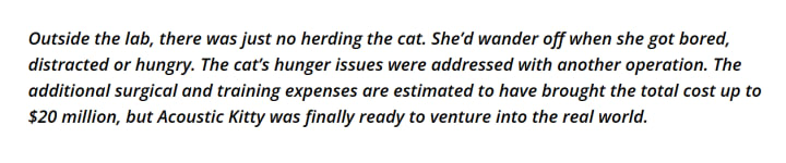 The extensively classified letter “Views on Trained Cats” in the National Security Administration library at George Washington University reveals the research wasn't a complete failure. The document states that the concept was not practicable for our very specific demands after examining trained cats for use in the program.