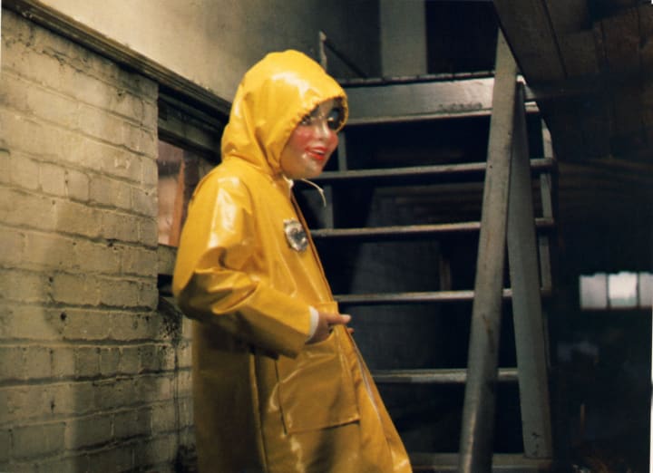 In the initial scenes of the film we see Alice don a yellow raincoat and translucent mask to terrorize her sister. Enraged that Karen has been selected to partake in her first communion, we are shocked but not a bit surprised when a figure in a yellow mac and eerie grinning mask brutally murders Karen, stuffing her in a chest and setting her alight before she can take communion. Alice then appears and kneels before the alter in Karen's place, her tongue lolling from her mouth in a nauseatingly suggestive expression for such a young girl, to accept the Eucharist. This devilish look and the blatant dress of the murderer onscreen confirms viewer's suspicions that Alice is indeed disturbed, and most certainly her sister's killer.