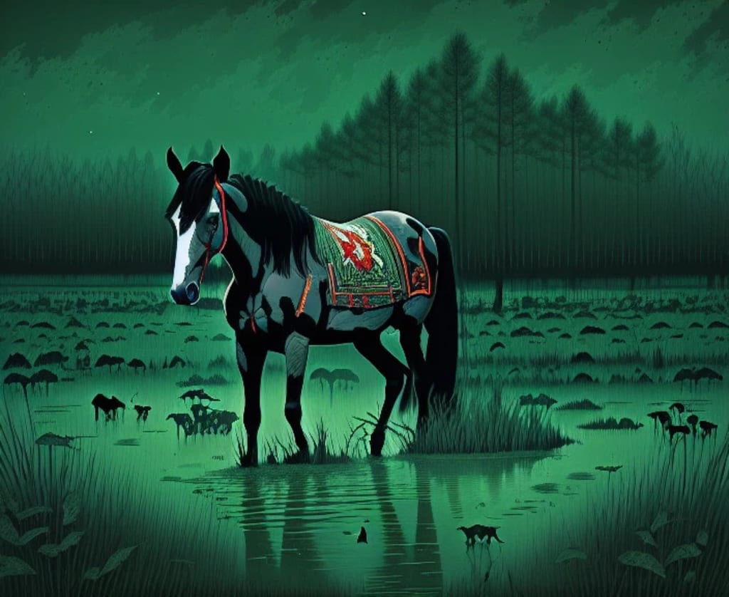 I begin to panic, the peace was broken and I didn’t know what to do. I look towards the horse’s face to see if it’s the horse’s fault and what stares back at me…isn’t normal. Its eyes were black before but now it was as if it didn’t have eyes. The fur once soft was now wet and slick to the touch. The hooves were now revered as well, is this…a Kelpie?
