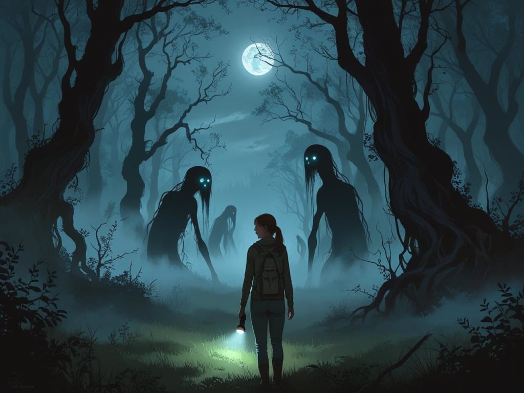 She cursed under her breath and fumbled for her spare batteries. When she finally replaced them, the beam of light illuminated a figure standing just beyond the trees. It was the same man—pale and gaunt, his eyes reflecting the dim light. But this time, there were others with him. Figures emerged from the darkness, their forms twisted and distorted. They were not fully human. Their limbs were too long, their faces too pale. Their eyes were hollow, empty voids, and their mouths hung open in silent screams.