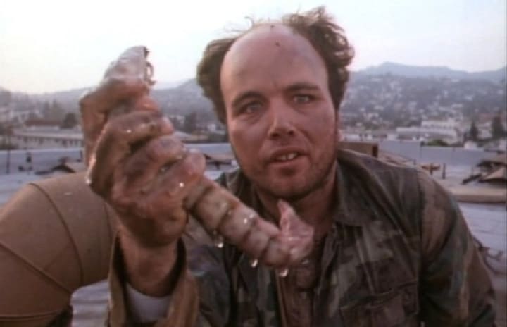 It's hilarious to watch this guy tell his story after he has been captured, because his acting is so over the top, that it really makes the movie for me. He even laughs evilly in some scenes, and the acting is so bad, it's good.