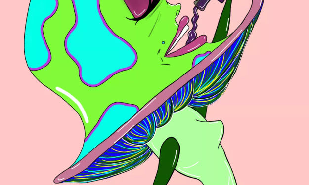 As Terri made it to the top, she set her feet on a hard surface and glided towards the slender figure. The figures long, razor-sharp fingers pinched the bottom of her chin and gave her a soft kiss on the lips. Then, using those fingers, cut a deep gash in the side of Terri’s neck. Terri stood there, as the blood poured out, unmoved. The figure took out a golden chalice, placed it at her neck and watched it filled with blood, then took a long glorious sip.