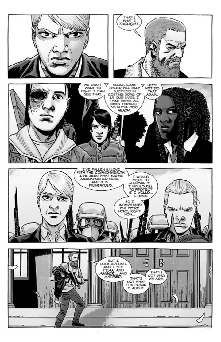 Pamela, however, still mistrusting Rick, returns a short while later with a squad of loyal Commonwealth soldiers to take down 'Rick's rebellion'. Rick, with the speech beginning in the panels above, manages to talk both sides into laying down their weapons and working towards a better future together.