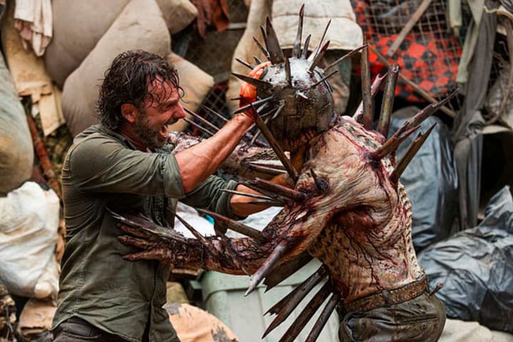 Between Rick coming to terms with Jadis and Father Gabriel earning his place in the group, it was quite a spectacular episode. However, we shouldn't forget to mention the most talked about scene in "New Best Friends" that involved Rick facing down a walker armed with deadly pikes all throughout its body, including a metal helmet covering its head equipped with even more knives and pikes.