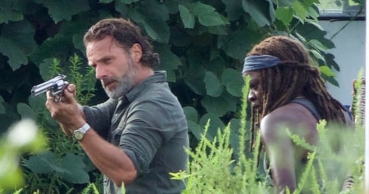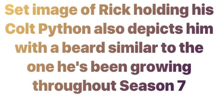 In the image embedded above, we can see that Rick is standing beside Michonne, holding his classic Colt-Python .357 revolver. Rick was last seen with his signature gun during the Season 6 Finale, before Negan and his Saviors cornered Rick's group and took their weapons. That means Rick's Colt-Python is in Negan's possession for the time being. However, with Rick (Andrew Lincoln) seen on the set of Season 7, holding a gun confiscated by Negan, it means he'll take it back from Negan soon enough. Rick can also be seen with a scruffier beard, indicating when this image takes place