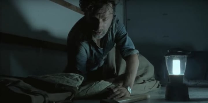 Season 7, Episode 7 "Sing Me A Song". Rick wakes up in back of trailer.