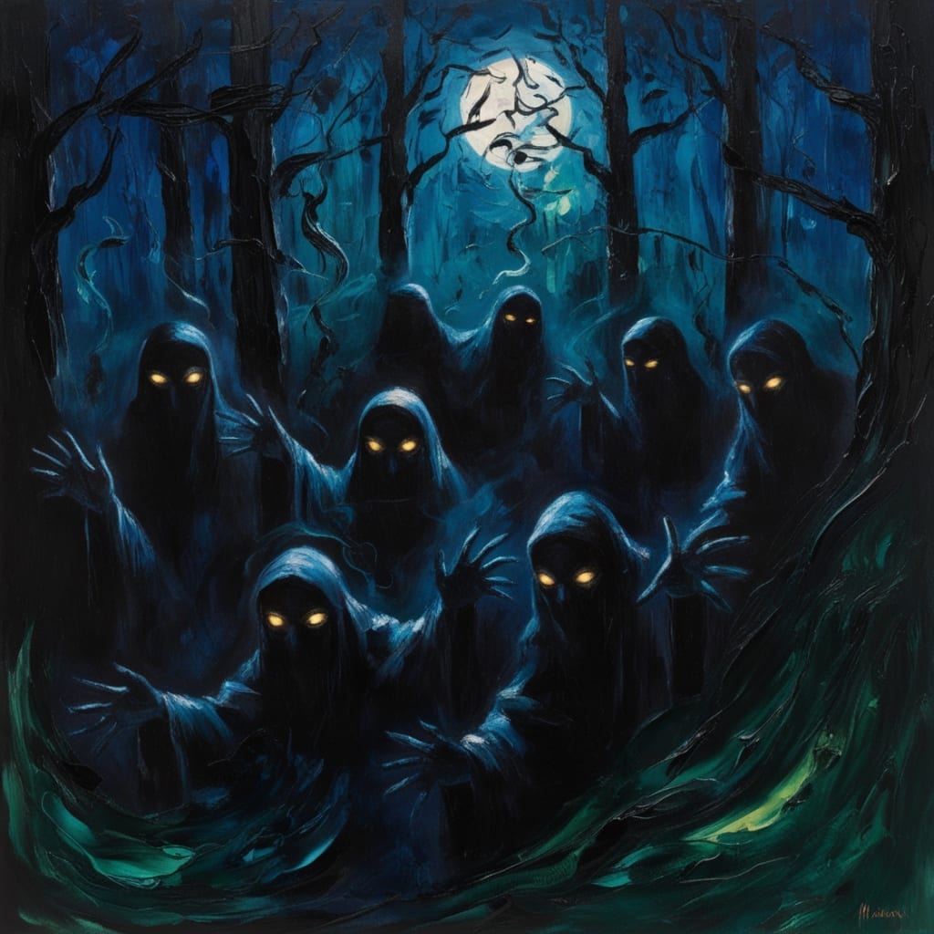 Figures, dark and indistinct, moved through the trees, their eyes glowing with a malevolent light. They reached out with elongated fingers, their touch icy and suffocating. Sarah stumbled backward, her heart pounding. She had to escape, but the forest seemed to close in around her, the shadows whispering her name.