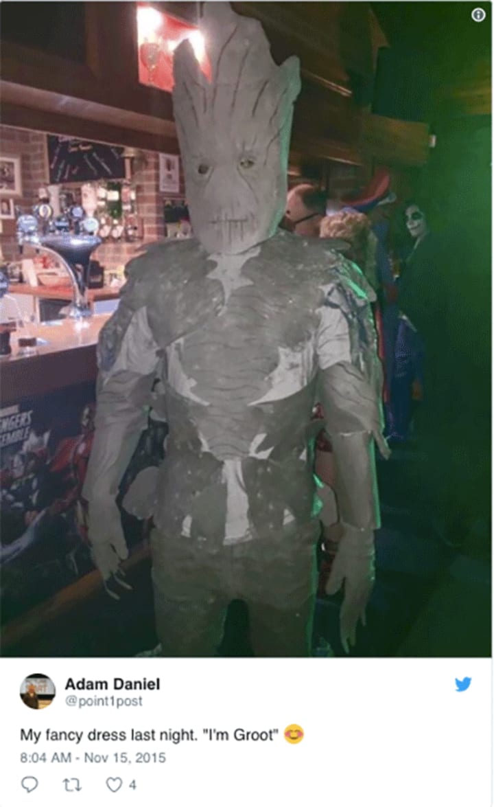 Not the easiest costume to pull off, but taking an axe to the garden and going as a walking tree from Marvel's #GaurdiansOfTheGalaxy is on the rise. If you too want to go as Groot, why not "branch" out with your own artsy take on the sci-fi scoundrel?