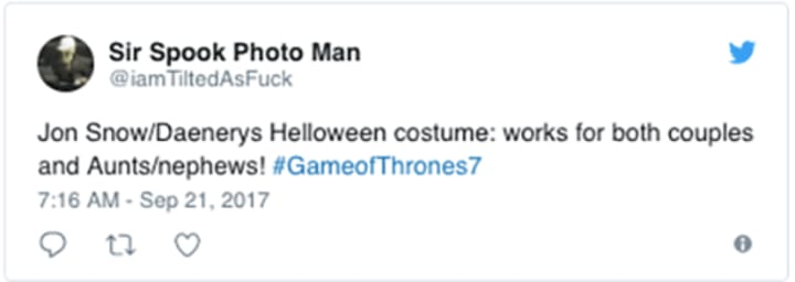 If you and your aunt are going somewhere together this Halloween and wan't to shock the neighbors, go as Jon and Daenerys from HBO's #GameofThrones. Pop to Ikea to get a rug for Jon Snow's Night's Watch shabby chic, and Dany is a simple blonde wig with some dragon Beanie Babies. Warning: Incest is not advised.