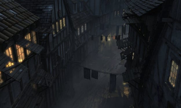 He heard a scream that made the hairs on the back of his neck stand up. He turned to look down an ally towards the right side of the road.