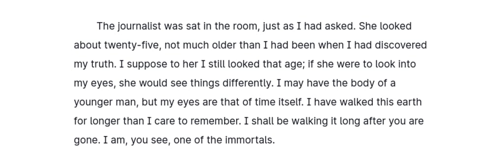 The journalist was sat in the room, just as I had asked. She looked about twenty-five, not much older than I had been when I had discovered my truth. I suppose to her I still looked that age; if she were to look into my eyes, she would see things differently. I may have the body of a younger man, but my eyes are that of time itself. I have walked this earth for longer than I care to remember. I shall be walking it long after you are gone. I am, you see, one of the immortals.