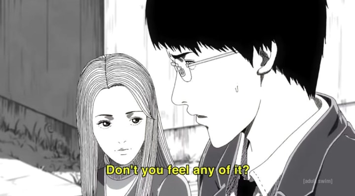 My thoughts: It was extremely fast-paced. Within 5 minutes your stomach is already turning. It follows the manga pretty closely but does mix the chapters a bit. The art is unbelievable. For it to be a black-and-white art style, with no flashing lights, no bright colors, or insane fight scenes to keep your attention and still have your eyes locked onto the screen is amazing. I couldn't take my eyes away for a second, and I felt completely sucked in.