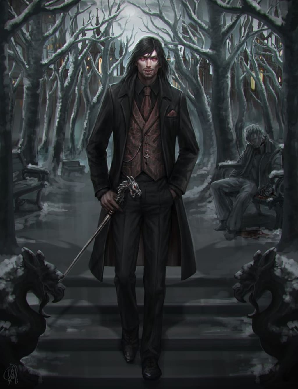 Vik's heart, even though a dead one, felt the desperation in her voice. It reminded him of another voice that came back to haunt him in a dream the day before. It was time. Suddenly, Vik stepped out of the shadows just behind the man. He grabbed the back of his neck and yanked him away. He plunged his blood thirsty fangs into the jugular of the man. Vik's eyes now a bright red.