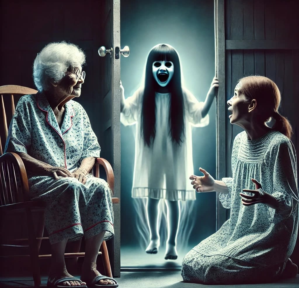 The door slammed shut. A sharp gasp escaped both women as their hearts pounded in their chests. The grandmother gripped her daughter’s hand tightly, her nails digging into her skin. From behind the door came a sound-a giggle. A child’s laughter, high-pitched and unsettling. Slowly, the door creaked open again, revealing a small figure standing in the shadows.