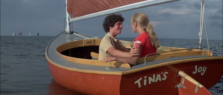 Halfway in the film, the teens decide to go on a sailing trip, unaware that they are being followed. Eddie and his girlfriend Tina decide to hang back, chill, have a drink, and spend some time together. Tina wants a blanket and Eddie goes to look. Both fail to notice the dorsal fin approaching. The Shark suddenly collides with their sailboat, knocking Eddie overboard and dragging the boat a good several hundred yards.