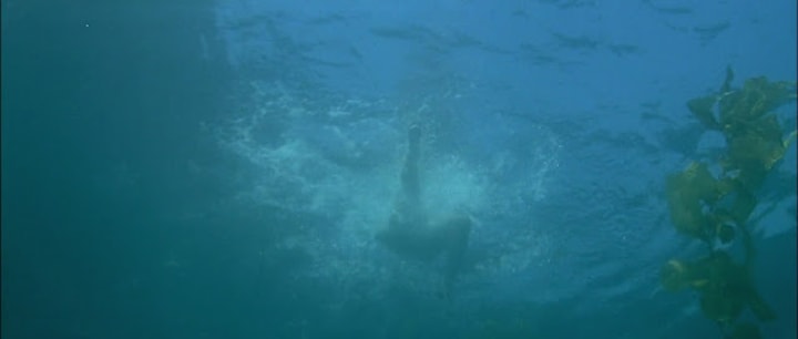 The scene that follows depicts the most terrifying things to see in the middle of the ocean. An approaching fin. The killer, the Shark is coming for its next victim. We have seen similar scenarios like this in slashers before. The friend/lover watches helplessly, screaming for them to "Run Faster" or “Get Out Of There" only to witness their demise. Eddie's death is a brutal one. He is swimming for his life against a bigger and faster predator, only to be grabbed by the beast and dragged violently through the waves into the side of his boat. He tries desperately to get himself into the safety of the boat, only to be pulled under with such force that he breaks part of his own boat off. Meanwhile, his girlfriend is in total shock, and helpless to do anything.